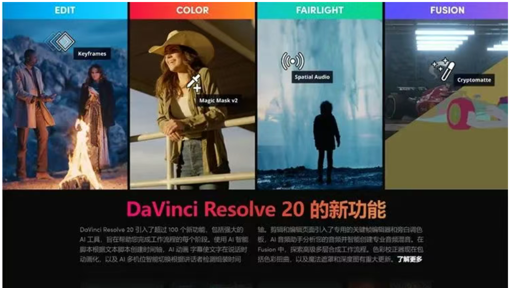 DaVinci Resolve Studio 20.2将剪辑、调色、特效、音频后期整合在同一个软件平台中,无需在不同软件间导出导入,极大提升了制作效率和工作流程的连贯性。