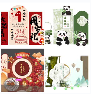 新中式宝宝宴素材宝藏!内含10套PSD/AI/CDR源文件,专为宝宝百日/周岁宴设计。一键替换宝宝照片与姓名,快速打造唯美国风背景墙与打卡点。