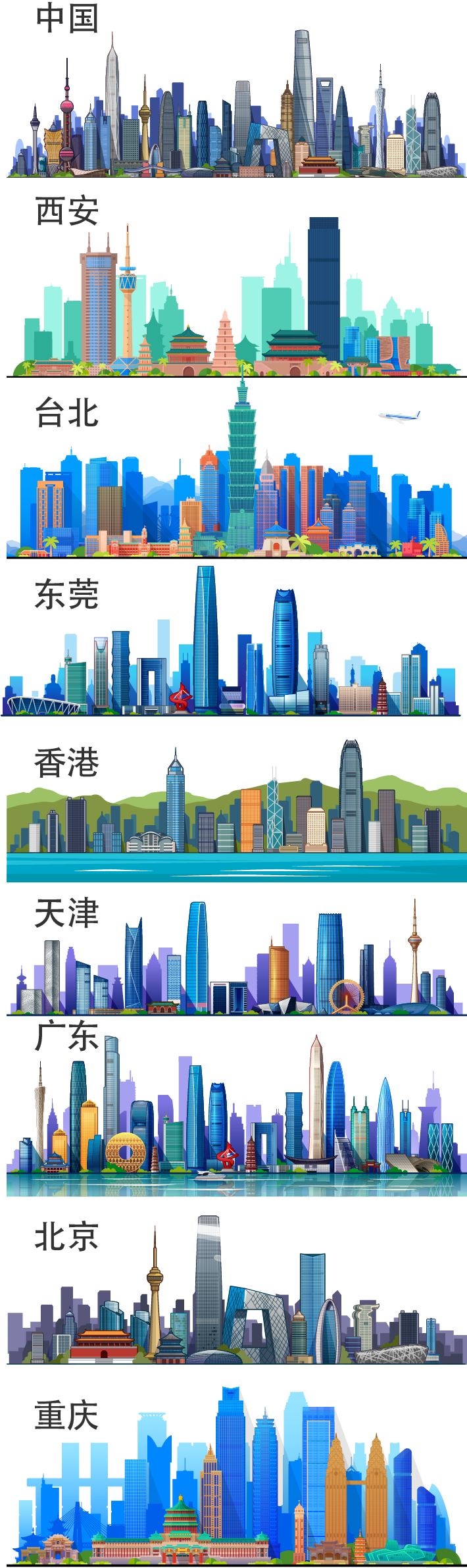 【国风典藏】西安/重庆/天津 城市地标建筑AI矢量设计素材合集(超百款场景插画与免扣元素)