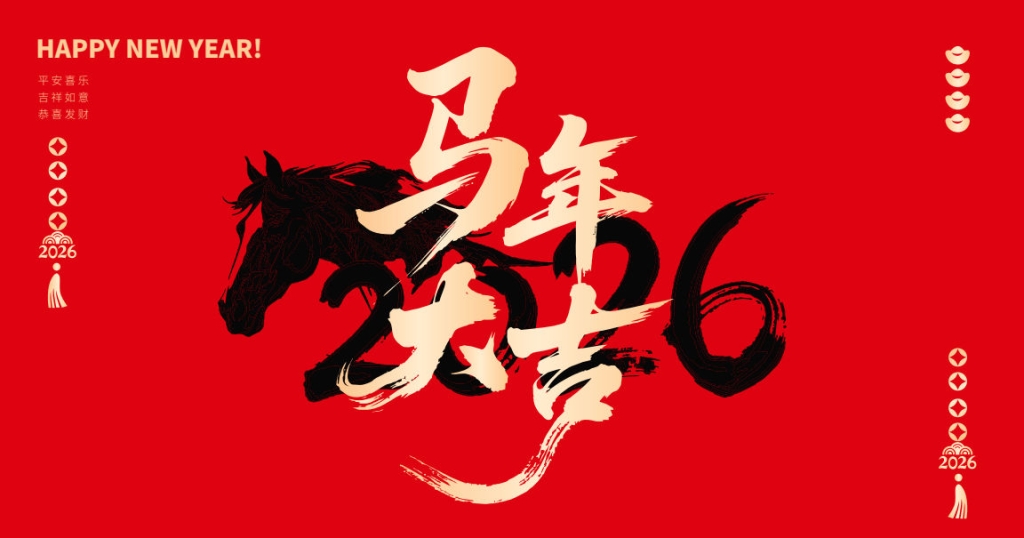 - 新中式插画:祥云、瑞马、牡丹、鎏金,节庆氛围浓厚