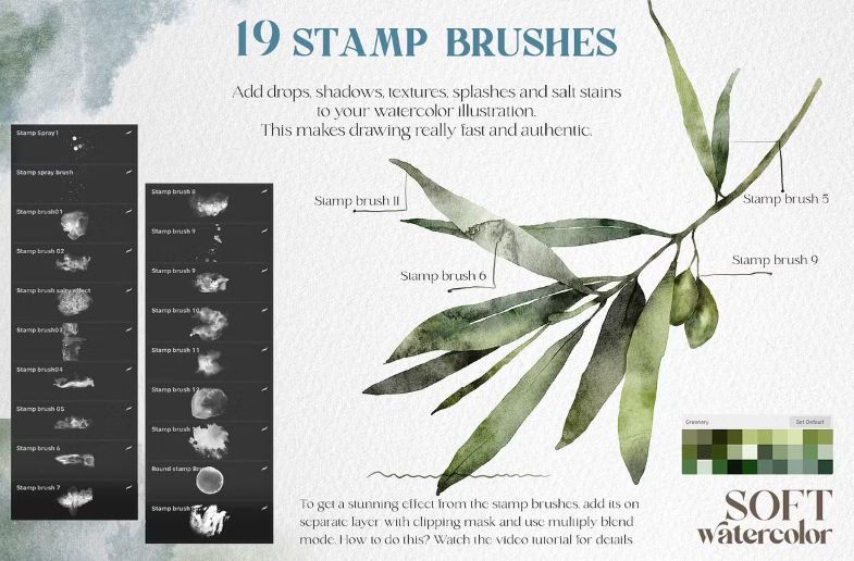 Procreate终极水彩工具包:逼真水痕晕染笔刷+背景纸纹+色卡,一套搞定数字水彩创作!